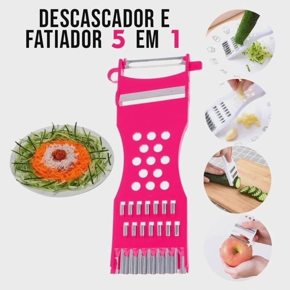 Descascador e Fatiador com 5 tipos de cortes diferentes em um só produto. Ideal para descascar laranjas, maças, cortar batatas formato palha, ralar chocolate, gengibre, fatiar legumes e frutas, entre outros.